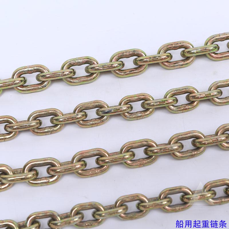 轮船上有轮船锚链,是采用80级起重链条,一节一节的链环组合而成的,在制作的过程中,经过焊接、热处理、拉伸等多道工序,才制作出来的吊装起重链条,耐高温起重链条在制作后都要经过检测,没问题才能在轮船中使用。圆环起重链条在湿气比较大的海水中也不容易出现腐蚀的情况。另外轮船中比较重的货物在进行搬运的时候,也会用到起重链条,配合手拉葫芦一起使用。节省了劳动力,也提高了搬运的效率。